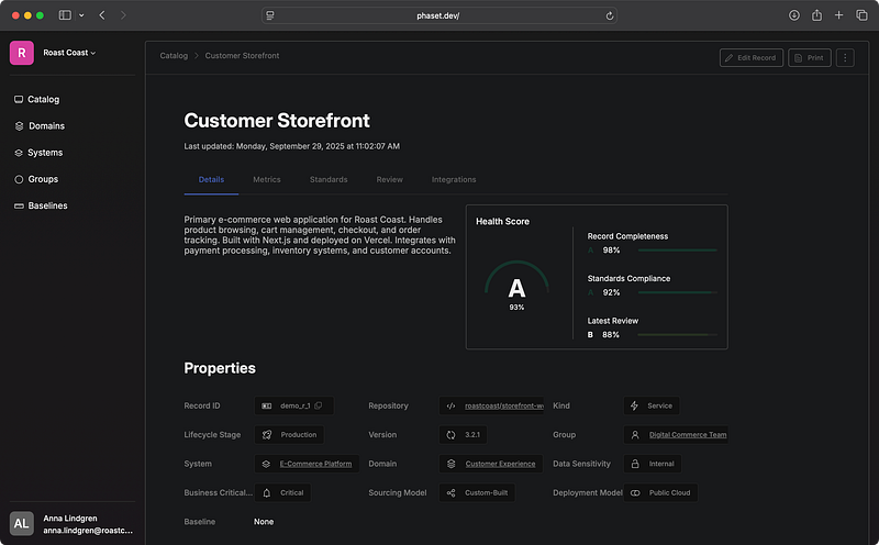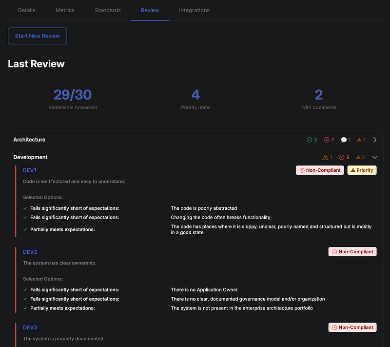 Phaset includes a structured review system — 30 questions across Architecture, Development, and Operations. These aren’t audits that people fear and loath. They’re conversation starters that create structured moments for teams to discuss what everyone knows but hasn’t said out loud: